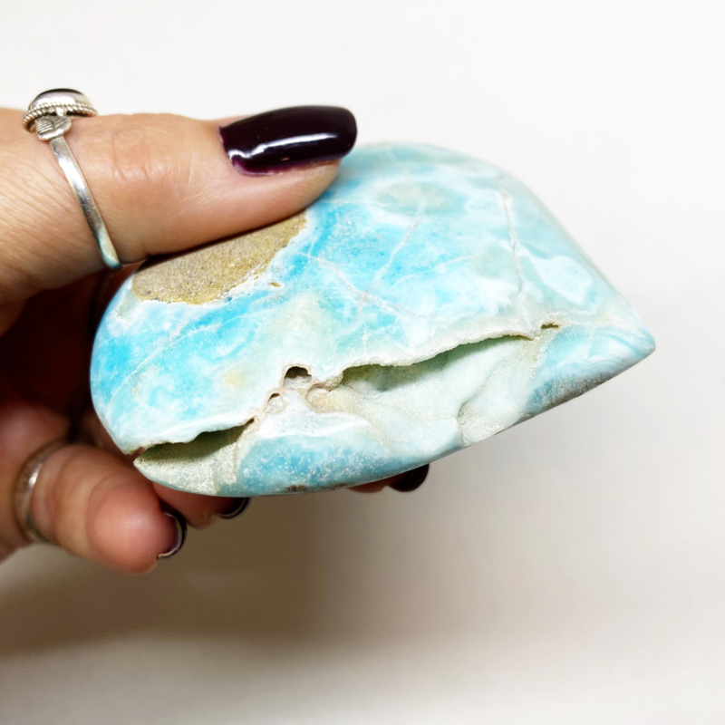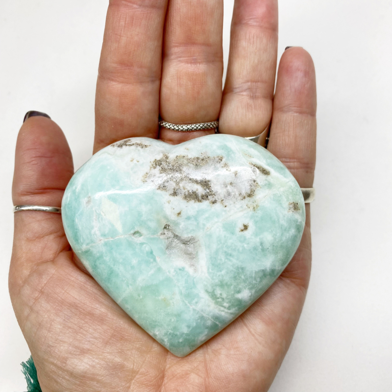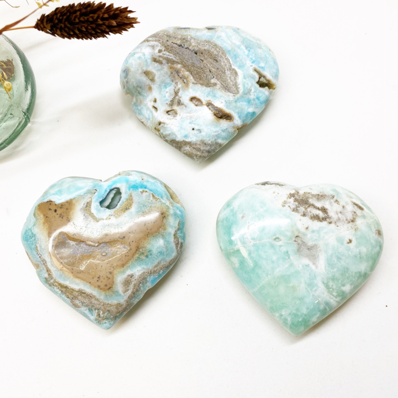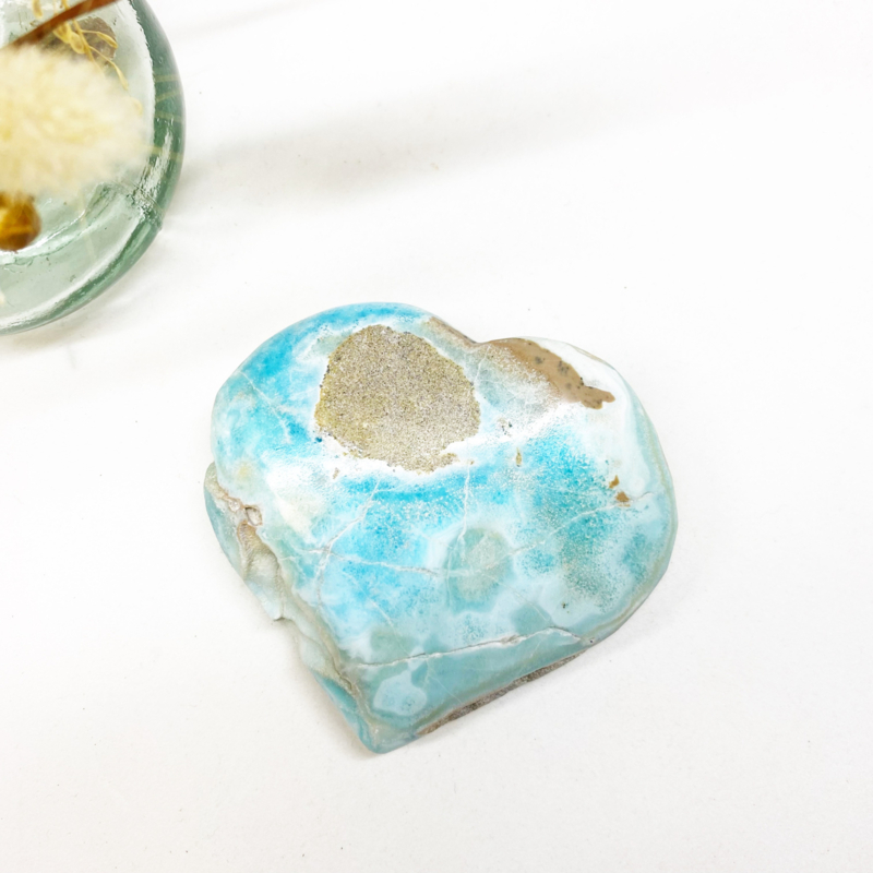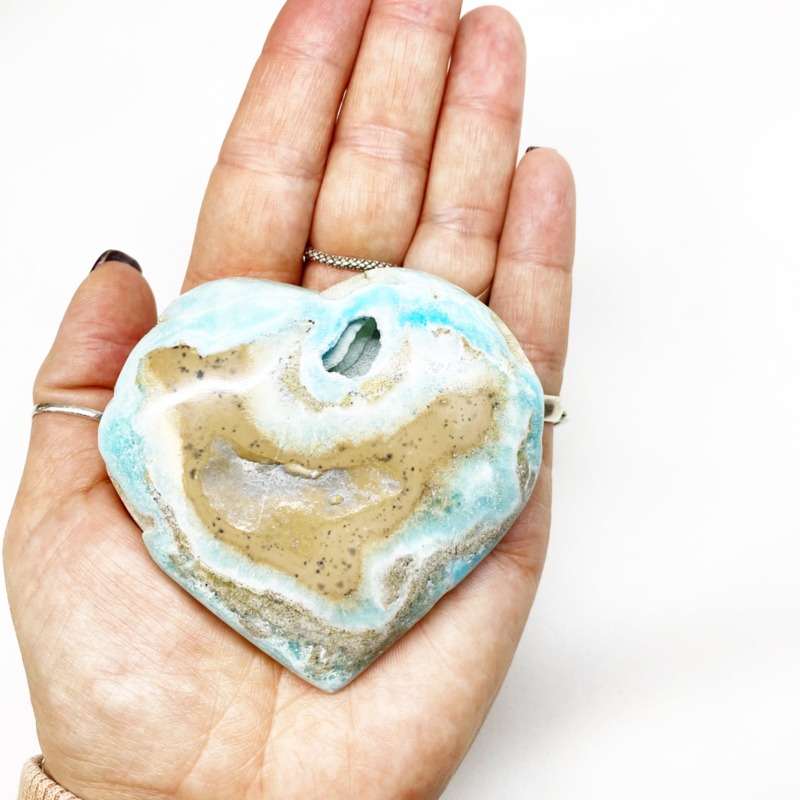 Dit tweede prachtige hart is een fractie kleiner dan nr 1 maar wel meer gekristalliseerd en opengewerkt. Deze edelsteen doet je denken aan een mooi tropisch strand. En net als het strand werkt deze steen kalmerend en rustgevend zijn werk met fijne energie.