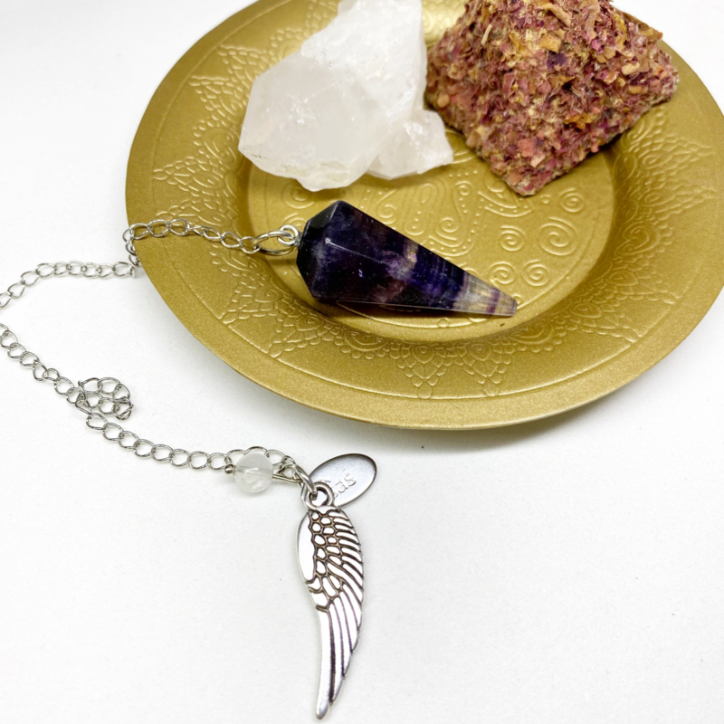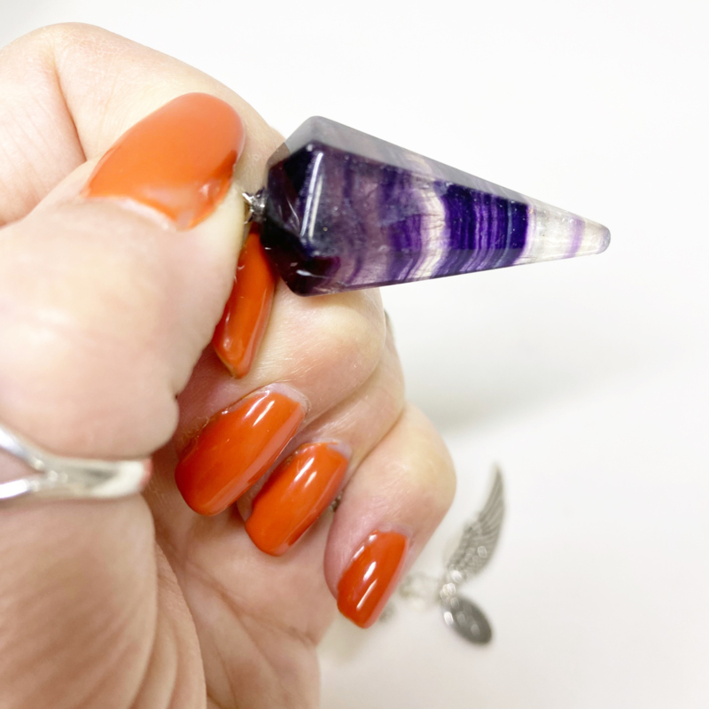 Een prachtige fluoriet pendel met een super vibratie. De edelsteen punt is 1,8cm breed, heeft een lengte van 3,85cm en weegt 13 gr.