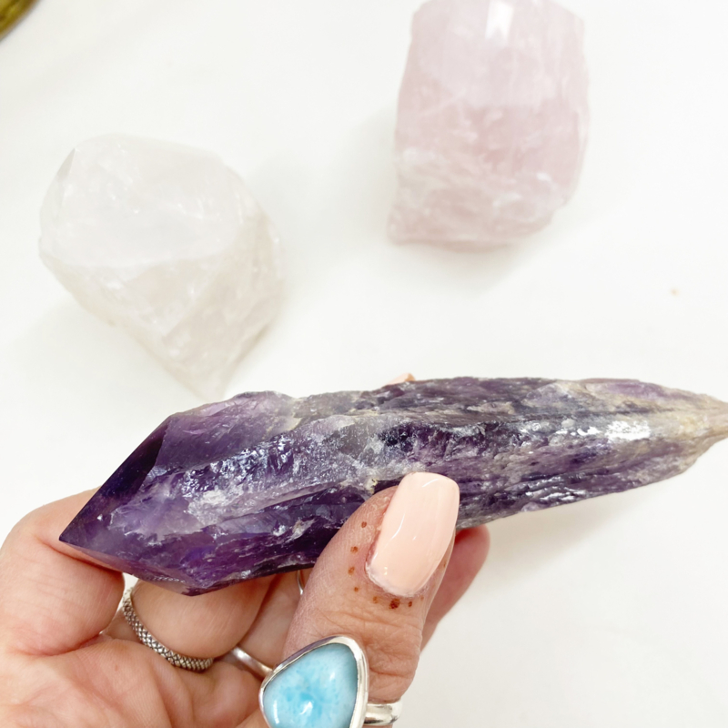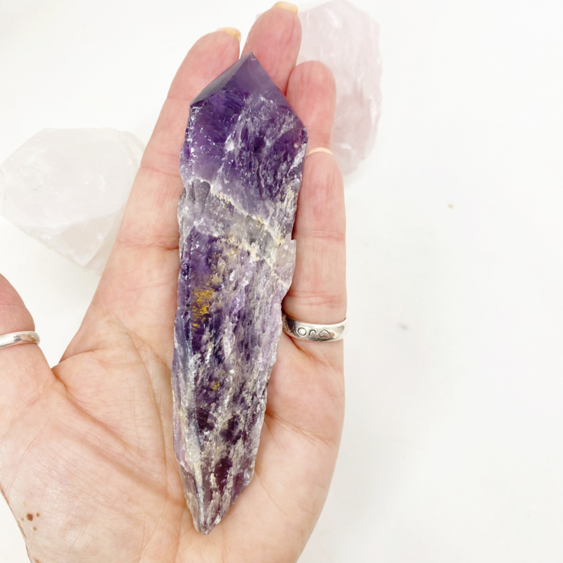 Amethist punt = 142gr. 3,3cm breed, 13,2cm lang en 2,8cm hoog