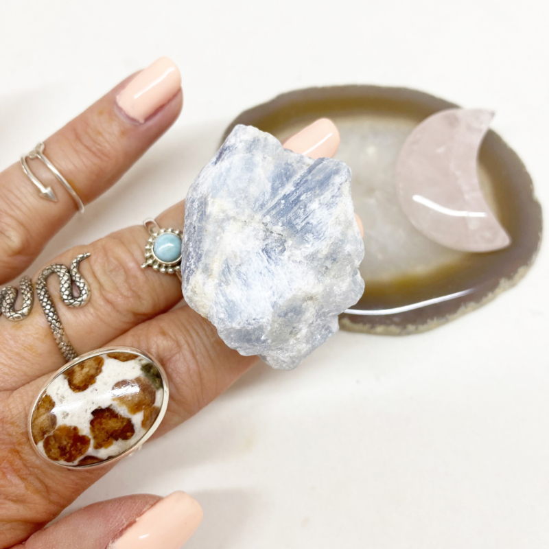 5x3,2cm Ruwe blauwe Calciet: Kalmeert de geest en geeft hoop en moed. Helpt bij communicatie en ontwikkeling. Verwijdert negatieve energieën door zijn liefdevolle vibratie.