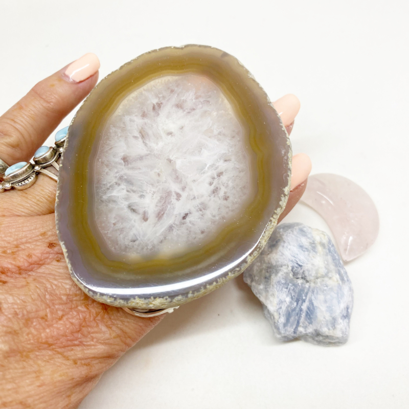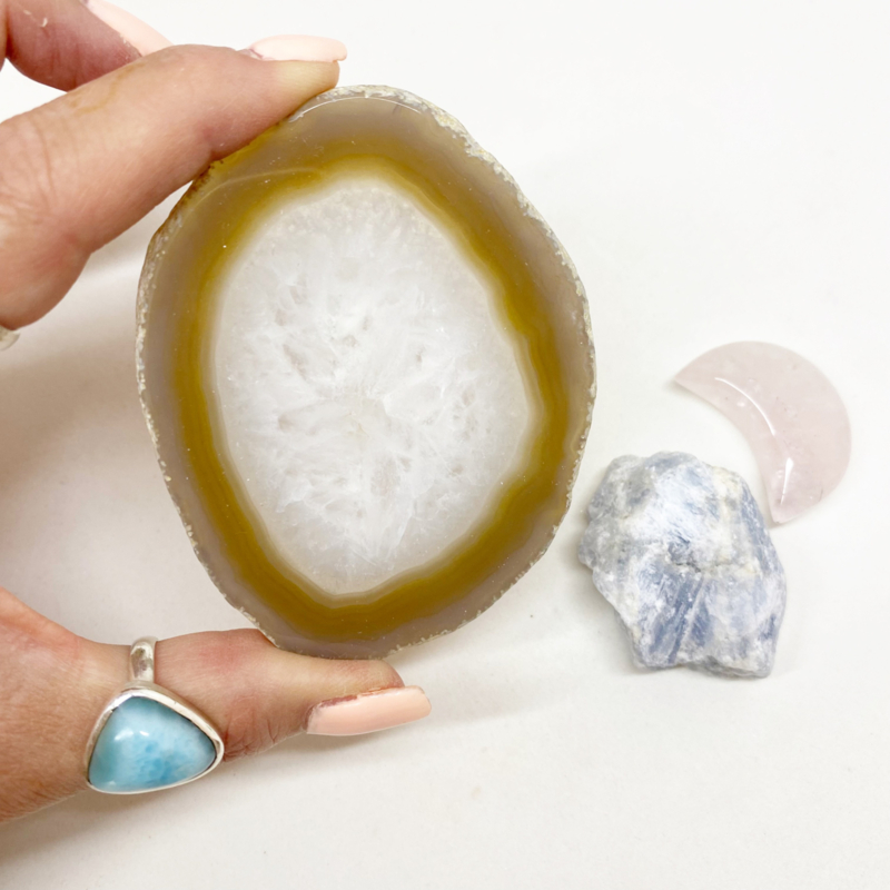 8,7x7cm Agaat schijfje: Werkt aardend en brengt balans. Geeft zelfvertrouwen en helpt bij concentratie. Bevordert innerlijke rust, geestelijk groei en helpt je om praktische oplossingen te vinden voor problemen.