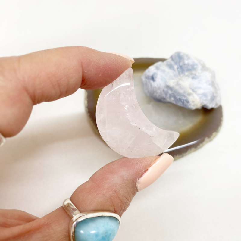 3,7x2,6cm Rozenkwarts maantje: Zorgt voor harmonie en herstelt vertrouwen. Stimuleert zelfliefde en werkt kalmerend en verzachtend bij verdriet en trauma.