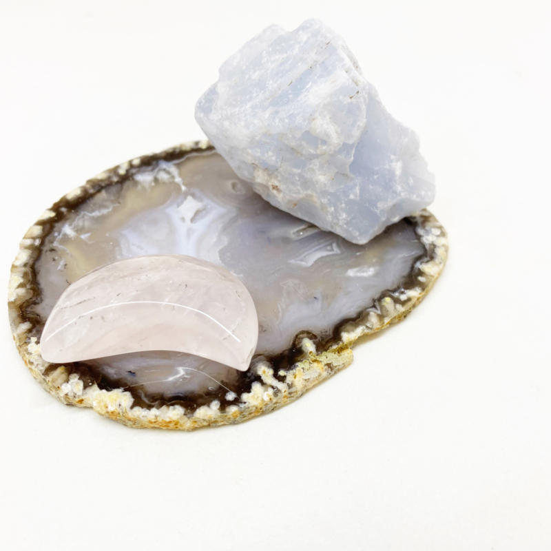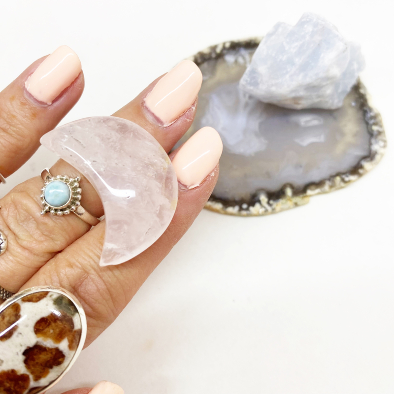 3,3x2,4cm Rozenkwarts maantje: Zorgt voor harmonie en herstelt vertrouwen. Stimuleert zelfliefde en werkt kalmerend en verzachtend bij verdriet en trauma.