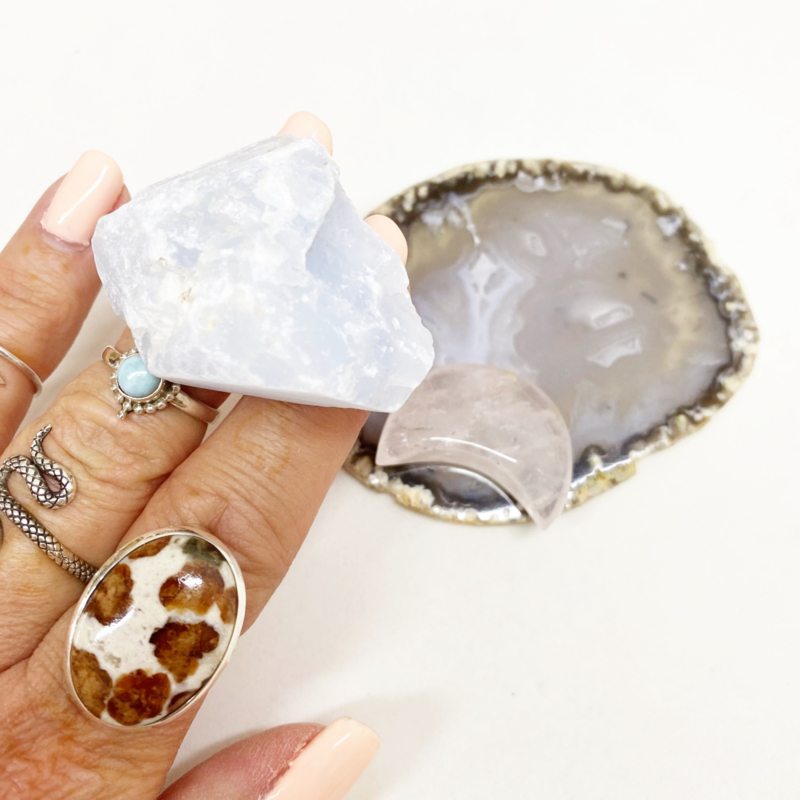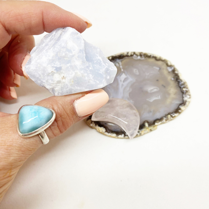 4,9x3,7cm Ruwe blauwe Calciet: Kalmeert de geest en geeft hoop en moed. Helpt bij communicatie en ontwikkeling. Verwijdert negatieve energieën door zijn liefdevolle vibratie.