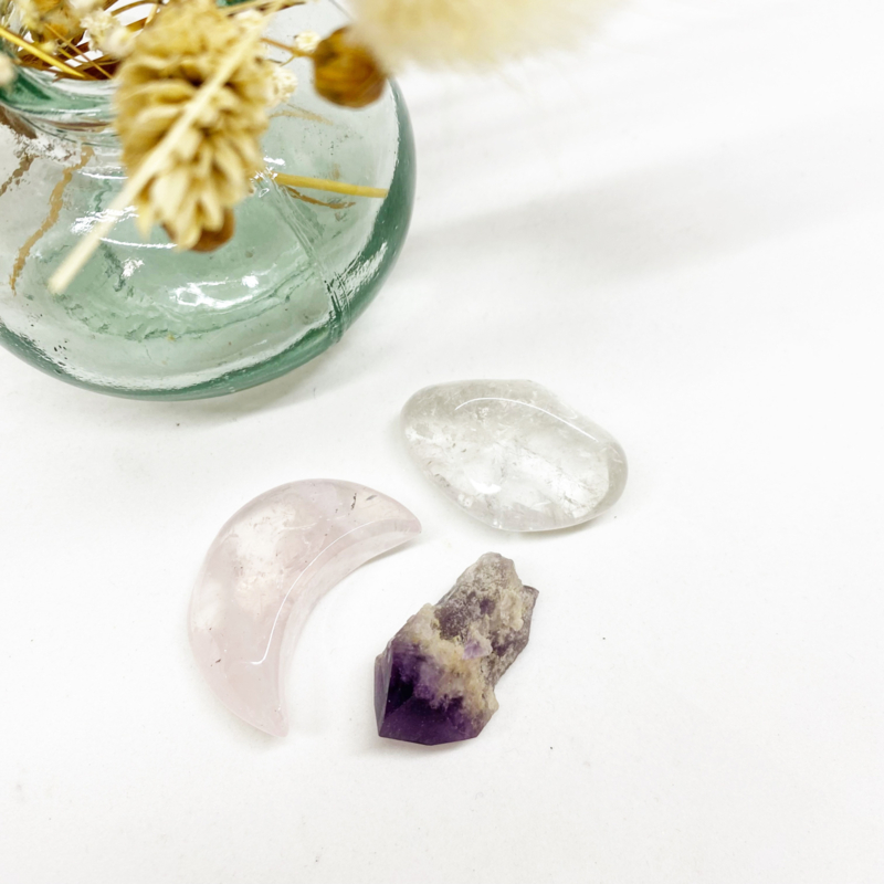 Een Gouden 3-hoek set bestaat uit Bergkristal, Amethist en Rozenkwarts en samen vormen zij de meest ideale energievorm voor in onze ruimtes (Kamer, hal, kantoor, slaapkamer).
