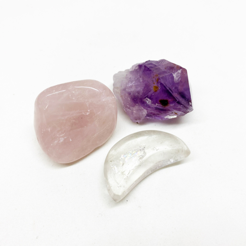 Een Gouden 3-hoek set bestaat uit Bergkristal, Amethist en Rozenkwarts en samen vormen zij de meest ideale energievorm voor in onze ruimtes (Kamer, hal, kantoor, slaapkamer).