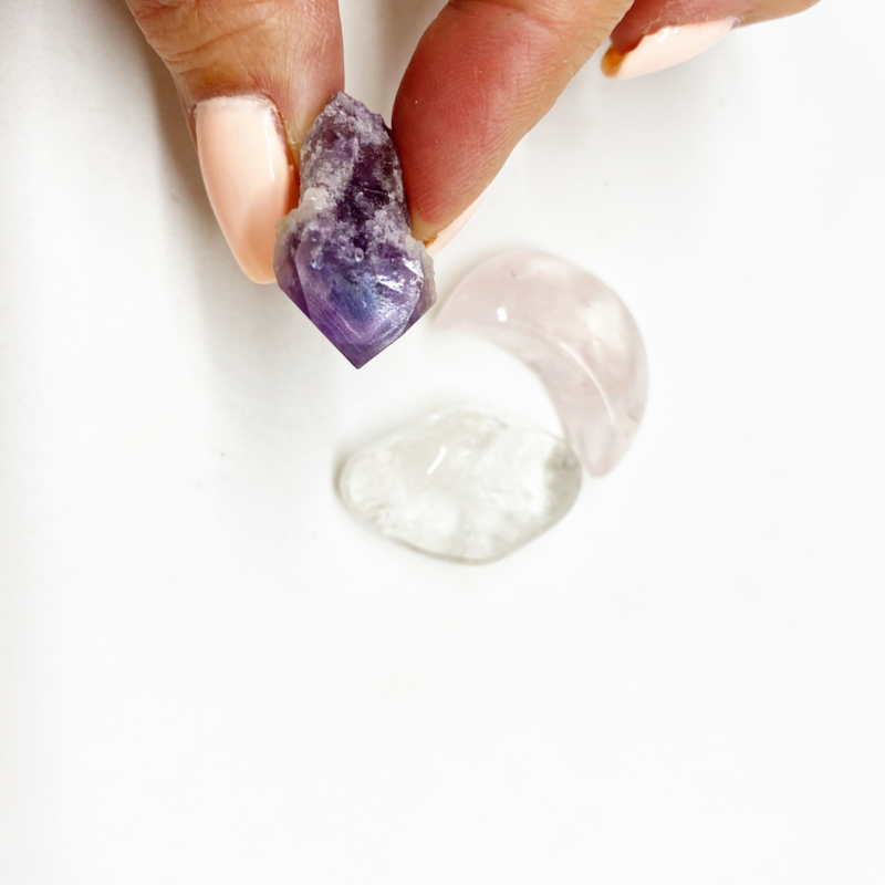 Een Gouden 3-hoek set bestaat uit Bergkristal, Amethist en Rozenkwarts en samen vormen zij de meest ideale energievorm voor in onze ruimtes (Kamer, hal, kantoor, slaapkamer).
