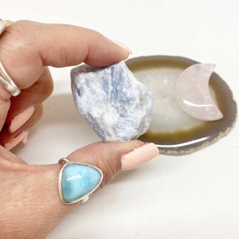 5x3,2cm Ruwe blauwe Calciet: Kalmeert de geest en geeft hoop en moed. Helpt bij communicatie en ontwikkeling. Verwijdert negatieve energieën door zijn liefdevolle vibratie.