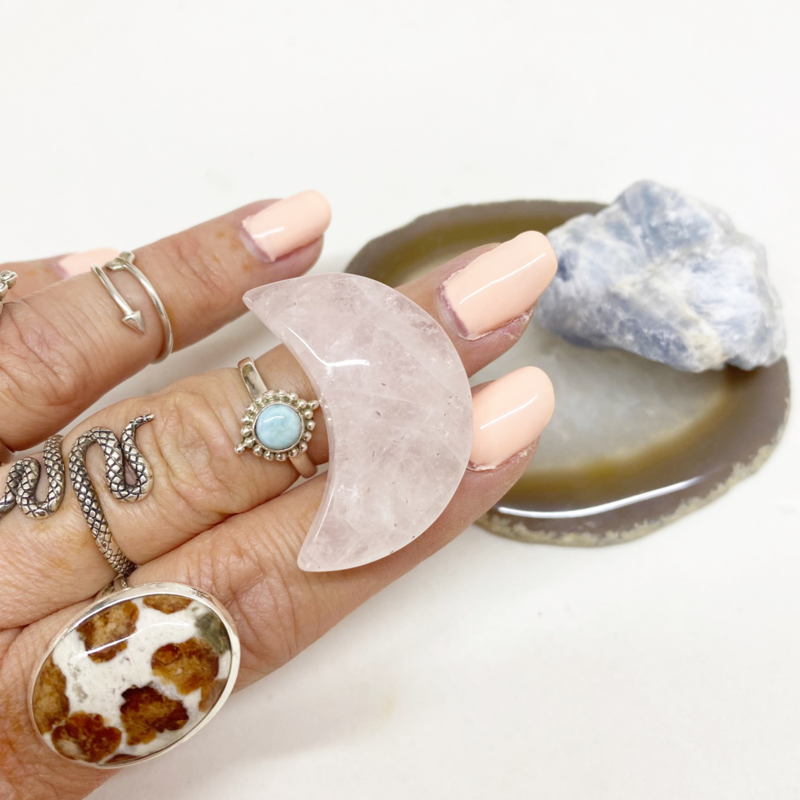 3,7x2,6cm Rozenkwarts maantje: Zorgt voor harmonie en herstelt vertrouwen. Stimuleert zelfliefde en werkt kalmerend en verzachtend bij verdriet en trauma.