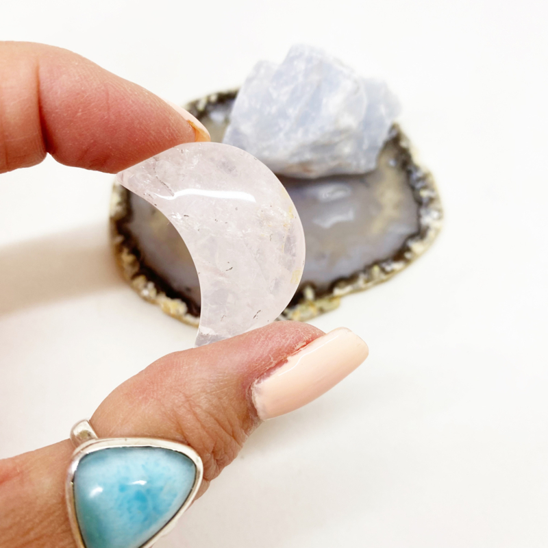3,3x2,4cm Rozenkwarts maantje: Zorgt voor harmonie en herstelt vertrouwen. Stimuleert zelfliefde en werkt kalmerend en verzachtend bij verdriet en trauma.