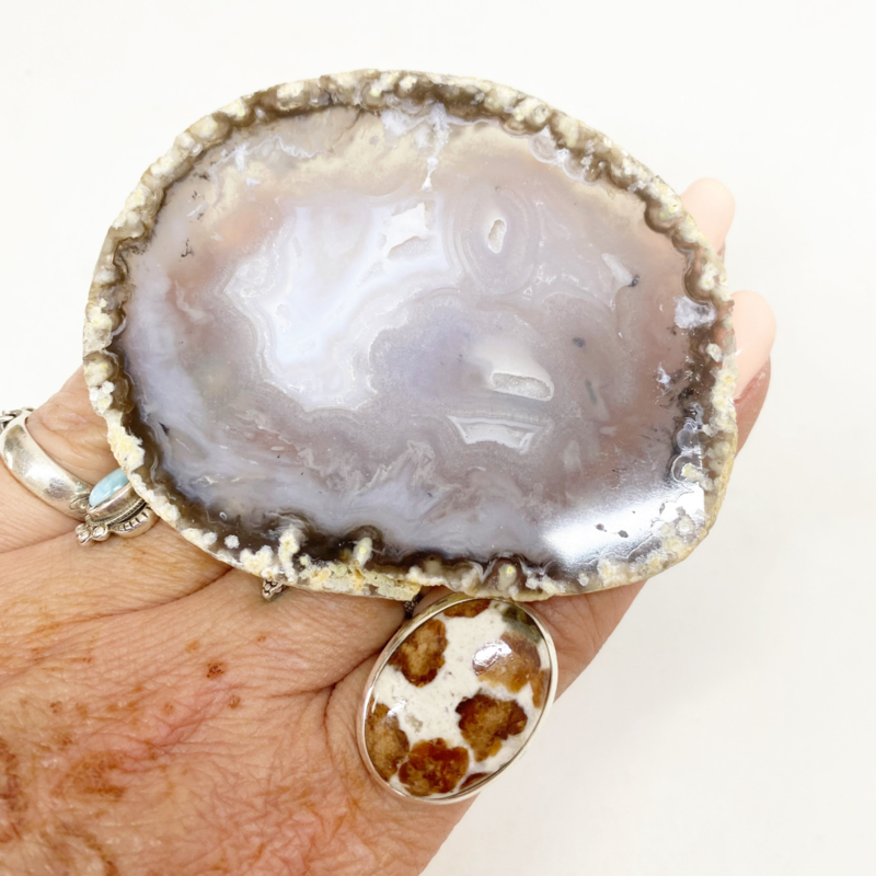 8,5x7cm Agaat schijfje: Werkt aardend en brengt balans. Geeft zelfvertrouwen en helpt bij concentratie. Bevordert innerlijke rust, geestelijk groei en helpt je om praktische oplossingen te vinden voor problemen.