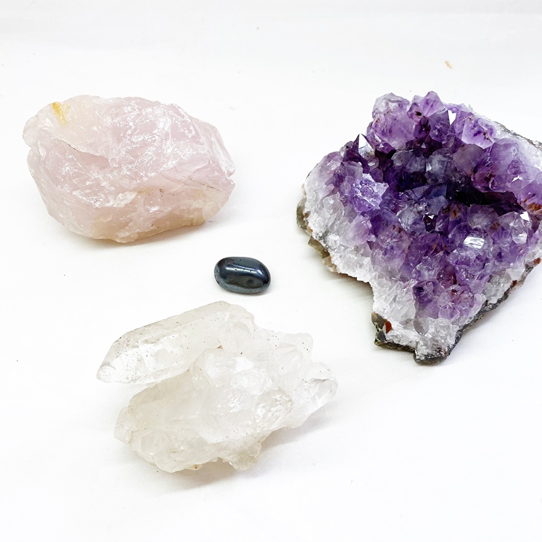 Een Gouden 3-hoek set bestaat uit Bergkristal, Amethist en Rozekwarts en samen vormen zij de meest ideale energievorm voor in onze ruimtes (woon-of slaapkamer, hal, kantoor, badkamer voor een spa-vibe). Bij By-Sas krijg er je er altijd een gratis Hematiet steentje erbij, want die hoort gewoon bij deze set.